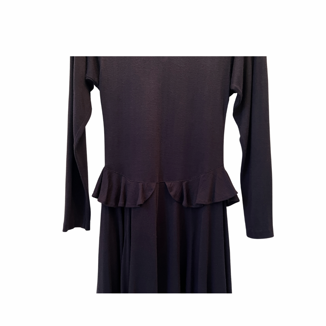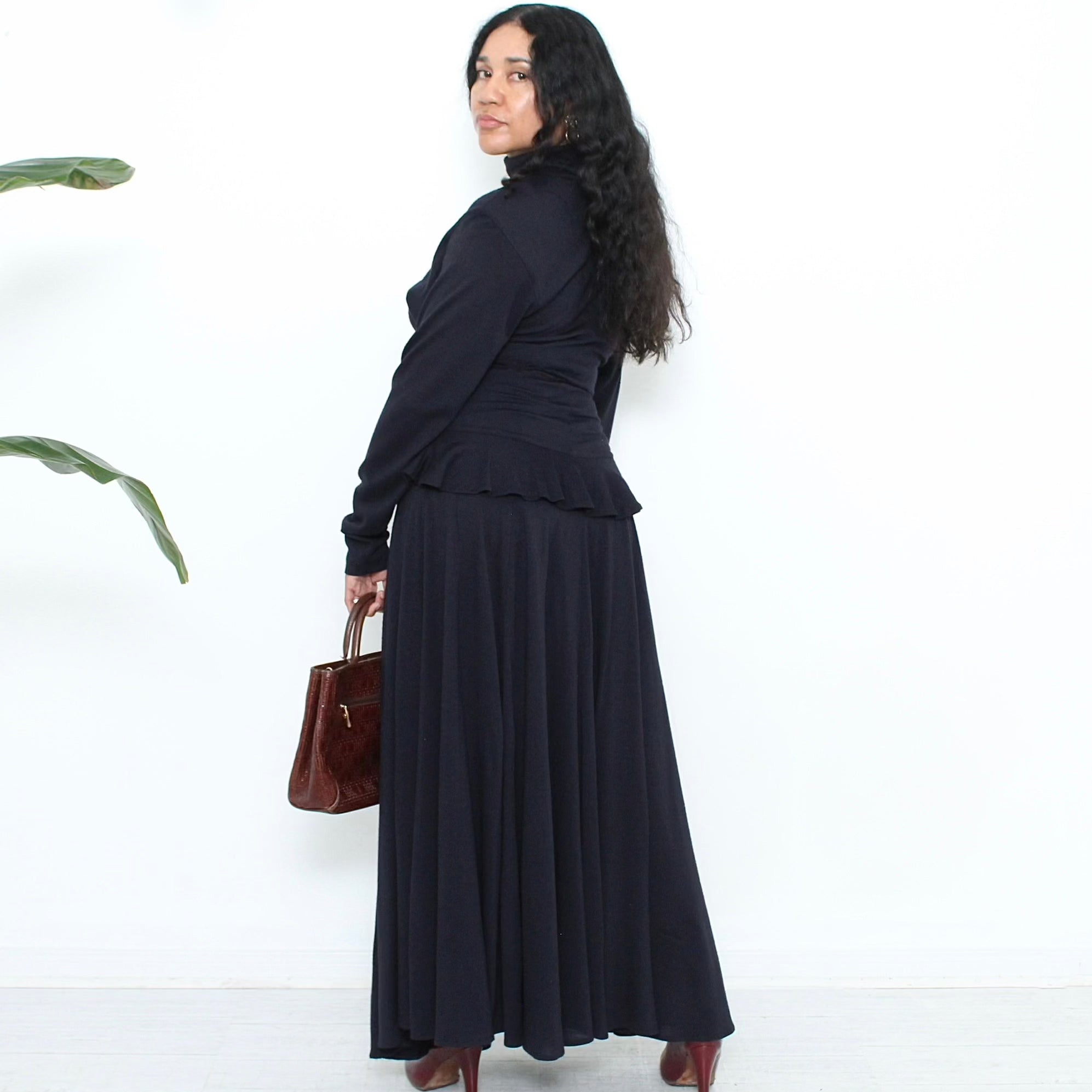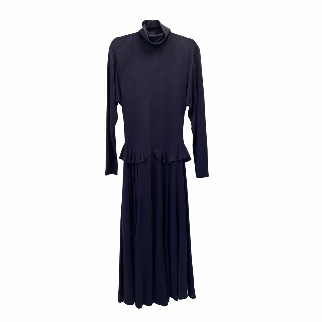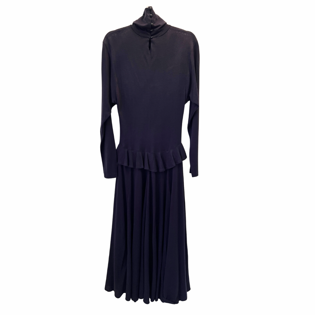 This amazing fine wool dress features a dropped peplum waist. extra long sleeves and a full skirt. Over the head wear with buttons along the back of the turtle neck.