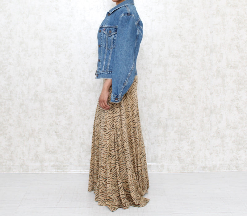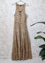 Gorgeous sleeveless animal print dress with a strikingly long silhouette that is slightly longer in the back. The fit is cut straight along the body and flares out with lots of voluminous movement below the knees, which is attributed to the triangular inserts or godets that gives this dress its flair. The arm holes of this dress are quite deep so larger busts may be revealing along the sides and the back portion has a slight racerback style. Such a great find that you can dress up with heels or wear with white sneakers.